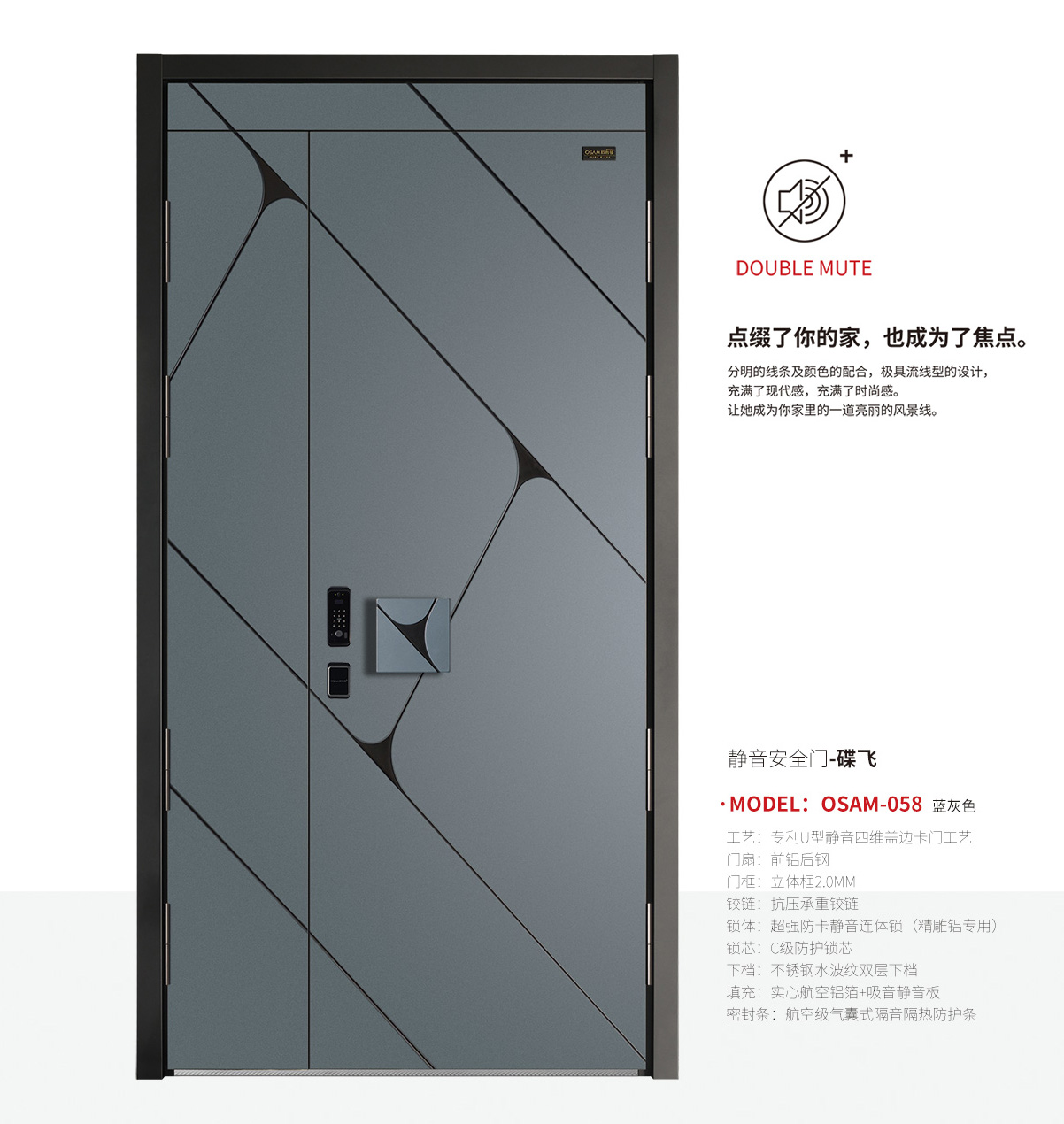 引領(lǐng)技術(shù)-歐奢曼全新打造靜音和安全雙系統(tǒng)安全門,為居者打造全新的生活方式。